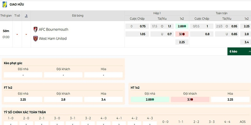 Soi Kèo AFC Bournemouth Vs West Ham United 01h00 04/08 – Giao Hữu Câu Lạc Bộ Loại kèoKèoDự đoánKèo châu ÁAFC Bournemouth Chấp 0/0.5 tráiChọn West HamKèo tài xỉu2.5/3Chọn TàiKèo châu ÂuAFC Bournemouth thắng với tỷ lệ 1:2.25.West Ham United thắng với tỷ lệ 1:2.8.Hoà 1:3.4.Chọn HòaKèo tỷ số chính xácDự đoán: 2-2AFC Bournemouth vs West Ham United thu hút sự chú ý đặc biệt từ những fan hâm mộ túc cầu. Trận đối đầu này sẽ các đội bóng phân hạng tại giải Premier League Summer Series. Vậy câu lạc bộ nào đang có được lợi thế vượt trội hơn? Hãy tham khảo bài viết tỷ lệ kèo để cập nhật những mức kèo ấn tượng nhất hôm nay nhé.Nhận định kèo trận AFC Bournemouth vs West Ham United 04/08Cuộc so tài giữa hai câu lạc bộ nổi tiếng của Ngoại hạng Anh luôn mang đến nhiều tỷ lệ kèo hấp dẫn. Đáng chú ý nhất trong số đó phải điểm qua các mức kèo nổi bật dưới đây:Kèo chấp 0/0.5Nếu xét về danh tiếng, cả hai câu lạc bộ đều thuộc nhóm đội thi đấu khó chịu tại Premier League. Do đó, cuộc chạm trán ngày 04/08 sắp tới giữa AFC Bournemouth vs West Ham United sẽ không có nhiều chênh lệch. Với phong độ nhỉnh hơn đôi chút, thầy trò HLV Iraola vẫn được xếp ở cửa trên.Tuy nhiên, câu lạc bộ này đã chưa thắng “Búa tạ” trong 5 trận gần nhất. Bởi vậy, mọi người có thể nhận định Handicap 0/0.5 bàn thắng nghiêng về câu lạc bộ West Ham.Dự đoán kèo chi tiết trận Bournemouth vs West HamKèo tài xỉu 2.5/3Ở 4 trong 5 trận đấu gần nhất của AFC Bournemouth xuất hiện từ 3 pha lập công trở lên. Con số đó bên phía West Ham United là 5/5 trận. Vì vậy, trận thư hùng ngày 04/08 sắp tới chắc chắn cũng xuất hiện rất nhiều bàn thắng. Các bạn chơi kèo tài xỉu hãy nhận định cửa Tài 2.5/3 trái.Kèo châu ÂuDo thực lực của hai câu lạc bộ không có nhiều cách biệt nên việc đưa ra nhận định về đội giành chiến thắng là không hề đơn giản. Tuy nhiên, các chuyên gia cập nhật kèo 1×2 với các thông số như sau:Cửa 1: AFC Bournemouth thắng với tỷ lệ 1:2.25.Cửa 2: West Ham United thắng với tỷ lệ 1:2.8.Cửa X: kết quả hòa với tỷ lệ 3.4.Thống kê phong độ AFC Bournemouth vs West Ham UnitedTrong quá trình chuẩn bị cho mùa bóng mới, cả hai đội AFC Bournemouth vs West Ham United đều có những trận giao hữu chất lượng. Theo đó, thành tích thi đấu của AFC Bournemouth đang có đôi chút nhỉnh hơn so với “Búa tạ”. Cụ thể như sau:Phong độ BournemouthTrong 5 lượt trận gần nhất, thầy trò ông Araola đã giành tới 4 chiến thắng và chỉ phải nhận 1 trận thua. Những kết quả này cho thấy sự đầu tư nghiêm túc để chuẩn bị cho mùa giải 2025/2026. AFC Bournemouth đã thắng Leicester City 2-0, Hibernian 2-1, Bristol City 6-2 và Everton 3-0.Trận thua mới đây nhất của câu lạc bộ này diễn ra trước Manchester United với kết quả 1-4. Thất bại này khiến AFC Bournemouth tụt xuống vị trí thứ hai trên BXH Premier League Summer Series.Điểm qua phong độ The CheriesPhong độ West Ham UnitedTrước trận đấu AFC Bournemouth vs West Ham United, “Búa tạ” đang có thành tích không mấy ổn định. Đội bóng được dẫn dắt bởi Graham Potter giành được 3 chiến thắng nhưng cũng để thua 2 trận trong 5 lượt đấu gần nhất.Đại diện của thủ đô London thắng cuộc trước Ipswich Town với kết quả 3-1, thắng Grasshopper 3-1 và Everton 2-1. Trong khi đó, hai trận thua của câu lạc bộ này diễn ra trước Manchester United (1-2) và Nottingham (1-2).Cập nhật phong độ West HamĐánh giá lịch sử chạm trán Bournemouth vs West Ham UnitedKể từ mùa giải 2019, AFC Bournemouth vs West Ham United đã gặp nhau tổng cộng 10 trận. Trong đó, đội bóng có biệt danh “Búa tạ” sở hữu thành tích lấn lướt hoàn toàn so với đối thủ. West Ham có được 4 chiến thắng và 5 trận hòa và chỉ phải nhận 1 thất bại duy nhất trước AFC Bournemouth.Nếu xét riêng 5 trận gần nhất, ưu thế cũng thuộc về đội bóng tới từ thành London. Họ đang bất bại với 1 thắng lợi cùng 4 trận hòa trước The Cherries.Lợi thế đối đầu nhỉnh hơn cho “Búa tạ”Dự kiến đội hình, tỉ số trận AFC Bournemouth vs West Ham UnitedTrước khi cặp đấu giao hữu ngày 04/08 diễn ra, hai câu lạc bộ AFC Bournemouth vs West Ham United gặp tổn thất khá lớn về mặt nhân sự. Bên phía Bournemouth, đội bóng này không thể tung ra sân Cook, Sinisterra và Unal. Trong khi đó, “Búa tạ” thiếu vắng hai chân sút quan trọng bao gồm Summerville và Mavropanos. Vì vậy, danh sách đá chính giữa hai câu lạc bộ gồm có:Bournemouth: Neto, Julian Araujo, Mepham, Senesi, Adam Smith, Adams, Alex Scott, Traore, Faivre, Evanilson, Brooks.West Ham: Areola, Aguerd, Kilman, Todibo, Walker-Peters, Diouf, Paqueta, Rodriguez, Ward-Prowse, Bowen, Fullkrug.Tham khảo đội hình AFC Bournemouth vs West Ham UnitedTừ những thông tin chi tiết về lực lượng hai đội, chuyên gia dự đoán đây là trận cầu vô cùng hấp dẫn. Với mục tiêu tối ưu là thử nghiệm lối chơi và đội hình, hai câu lạc bộ chắc chắn sẽ thi đấu cởi mở. Khả năng cao trận đấu sẽ khép lại bằng kết quả hòa 2-2