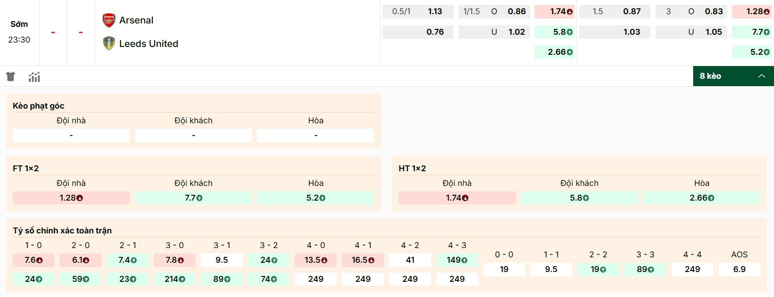 Soi Kèo Arsenal Vs Leeds United 23h30 23/08 – Vòng 2 Ngoại Hạng Anh LOẠI KÈOKÈODỰ ĐOÁNKÈO CHÂU ÁArsenal -1.5 tráiChọn ArsenalKÈO TÀI XỈU3Chọn TàiKÈO CHÂU ÂUArsenal thắng tỷ lệ 1:1.28Leeds United thắng tỷ lệ 1:7.7Hoà 1:5.2Chọn ArsenalKÈO TỶ SỐ CHÍNH XÁCDự đoán: 3-1Thời gian: 23h30 (giờ Hà Nội), thứ Bảy, ngày 23/08/2025.Địa điểm: Sân vận động Emirates Stadium.Trận đấu diễn ra thuộc Vòng 2 giải Ngoại hạng Anh 2025/2026.Arsenal vs Leeds United sẽ tạo nên trận đấu hấp dẫn tại lượt trận thứ 2 Ngoại hạng Anh 2025/2026. Đại diện đến từ thủ đô London có thể giành thắng lợi dễ dàng trước câu lạc bộ vừa lên hạng không? Mức kèo đáng chú ý nhất xuất hiện trong cuộc chạm trán ngày 23/08 là gì? Cùng tham khảo bài viết tỷ lệ kèo nhà cái để giải mã thông tin nhận định từ chuyên gia nhé.Thông tin soi kèo Arsenal vs Leeds United 23/08Cặp đấu giữa hai đội bóng này được người chơi đặc biệt quan tâm khi mang đến mức kèo ấn tượng. Dưới đây là một số tỷ lệ nổi bật nhất xuất hiện trong màn đối đầu giữa Arsenal vs Leeds United:Kèo chấp 1.5 tráiĐội chủ sân Emirates đang có thành tích chạm trán vượt trội hoàn toàn trước Leeds. Kể từ năm 2003 đến nay, Pháo thủ thành London chưa từng thua trước đối thủ. Bên cạnh đó, với việc được chơi tại sân nhà trong lượt trận thứ 2 Ngoại hạng Anh, The Gunners được nhận định ở cửa trên. Nếu muốn dự đoán kèo chấp trong cuộc chạm trán giữa hai đội, bạn nên chọn tỷ lệ Handicap 1.5 trái nghiêng về Pháo thủ.Nhận định kèo trận đấu Arsenal vs Leeds UnitedKèo tài xỉu 3 tráiTrận cầu giữa Arsenal vs Leeds United được chuyên gia dự đoán với tỷ lệ tài xỉu bàn thắng hấp dẫn. Điều này là bởi hàng tấn công của đội chủ nhà mới có những sự bổ sung cực kỳ chất lượng, đặc biệt là Gyokeres. Bên cạnh đó, trong 5 cuộc chạm trán gần nhất giữa 2 đội, Arsenal đã ghi đến 13 bàn thắng vào lưới Leeds. Bởi vậy, các bạn hãy lựa chọn kèo Tài 3 trái trong trận đấu ngày 23/08.Kèo châu ÂuỞ thời điểm hiện tại, Pháo thủ thành London được đánh giá rất cao từ lối chơi đến phong độ. Vì vậy không có gì bất ngờ khi đội chủ sân Emirates được dự đoán sẽ có được trọn vẹn 3 điểm. Bảng kèo 1×2 trong cặp đấu này gồm có:Cửa 1: Arsenal thắng tỷ lệ 1:1.27.Cửa 2: Leeds United thắng tỷ lệ 1:7.8.Cửa X: kết quả hòa tỷ lệ 1:5.2.Đánh giá phong độ giữa Arsenal vs Leeds UnitedTrước cuộc chạm trán ở vòng 2 Ngoại hạng Anh, 2 đội bóng đều không được đánh giá quá cao ở kết quả thi đấu các trận gần đây. Các chỉ số phong độ được cập nhật trong 5 lượt trận đã qua của 2 CLB gồm có:Chủ nhà ArsenalĐương kim Á quân Premier League 2024/2025 không có được kết quả tốt nhất trong những trận gần đây. Theo đó, Pháo thủ thành London giành chiến thắng 3 trận nhưng cũng phải nhận 2 thất bại ở 5 trận gần nhất.Phong độ The GunnersThầy trò HLV Arteta vượt qua các đối thủ sừng sỏ như Athletic Bilbao 3-0, thắng Newcastle 3-2 và đánh bại AC Milan 1-0. Tuy nhiên, câu lạc bộ này cũng đón nhận 2 trận thua trước Tottenham 0-1 và Villarreal 2-3.Đội khách Leeds UnitedTrước khi cặp đấu Arsenal vs Leeds United ngày 23/08 diễn ra, ĐKVĐ Championship đang trải qua chuỗi trận bất bại ấn tượng. Ở 5 lượt trận gần đây, Leeds có 2 thắng lợi bên cạnh 3 trận cầu chia điểm.Những chiến thắng của đội bóng này đều diễn ra tại Hạng nhất Anh mùa 2024/2025 trước Bristol City 4-0 và Plymouth 2-1. Trong khi đó, ở 3 trận giao hữu trước mùa giải Leeds chỉ có được 3 kết quả hòa trước Manchester United 0-0, Villarreal 1-1 và AC Milan 1-1.Phong độ Leeds UnitedLịch sử thi đấu giữa Arsenal vs Leeds UnitedXuyên suốt lịch sử Ngoại hạng Anh, hai đội bóng chạm trán tổng cộng 30 lần. Thống kê được thực hiện bởi chuyên gia cho thấy Pháo thủ thành London có ưu thế lớn hơn với 17 chiến thắng và 5 trận hòa. Ở bên kia chiến tuyến, Leeds United mới chỉ có 8 lần đánh bại The Gunners.Nếu chỉ xét riêng 5 trận gần nhất của 2 đội, Arsenal vẫn được đánh giá rất cao. Thầy trò HLV Arteta đã toàn thắng trong cả 5 trận cầu đó và ghi được 14 bàn thắng, nhận 3 bàn thua.Lợi thế đối đầu thuộc về Pháo thủDự kiến đội hình, tỉ số Arsenal vs Leeds United 23/08Để chuẩn bị cho màn tiếp đón Leeds ở vòng 2, đội bóng thủ đô London đang có được các nhân sự tốt nhất. Arsenal chỉ thiếu vắng duy nhất vị trí của Trossard. Ở bên kia chiến tuyến, HLV Farke không có sự phục vụ của 2 hậu vệ gồm Bornauw vì chấn thương và Bijol vì thẻ phạt. Dưới đây là những gương mặt sẽ được 2 chiến lược gia tin dùng trong trận đấu tới:Arsenal: Raya, Gabriel, Calafiori, Saliba, Timber, Madueke, Zubimendi, Rice, Saka, Odegaard, Gyokeres.Leeds United: Darlow, Debayo, Ampadu, Rodon, Gudmundsson, James, Tanaka, Stach, Chambers, Piroe, Calvert-Lewin.So sánh lực lượng 2 CLB trước vòng 2 EPLTừ các chân sút góp mặt trong đội hình chính thức, các bạn có thể mong đợi trận đấu Arsena