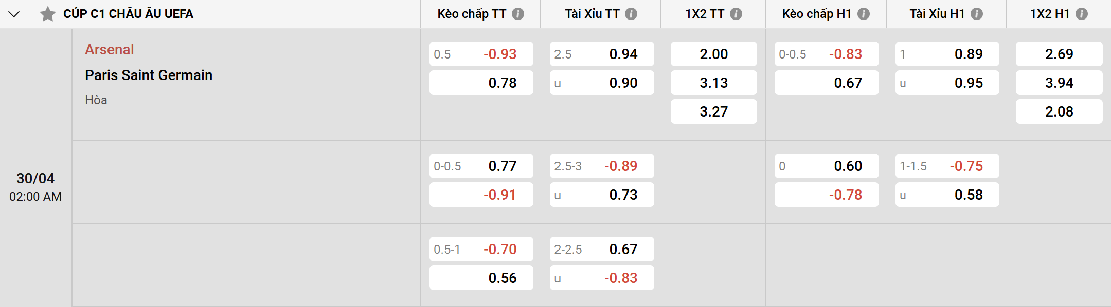 Soi Kèo Arsenal Vs PSG 02h00, 30/04/2025 Bán Kết C1 Đối thủ tiếp theo của Arsenal trên con đường tới chiếc cúp bạc Champion League là đội bóng đến từ nước Pháp – Paris Saint Germain. Cùng tỷ lệ kèo tổng hợp thêm thông tin để soi kèo trận bán kết C1 được trông chờ – Arsenal vs PSG chính xác hơn.Tổng hợp về soi kèo Arsenal vs PSGPháo thủ sẽ gặp lại PSG trong trận đấu bán kết Champion League năm nay vào rạng sáng ngày 30/4 tại sân vận động Emirates. Đón tiếp đội bóng nước Pháp ngay tại sân nhà, Arsenal đang có tham vọng rất lớn để tiến vào trận chung kết và giành chức vô địch. Tìm hiểu kỹ hơn và nhìn theo bảng kèo dưới đây:Tỷ lệ kèo trận đấu Asenal vs PSGPhong độ và vị trí trên BXHỞ tứ kết, thầy trò huấn luyện viên Mikel Arteta đã đánh bại đội bóng hoàng gia Tây Ban Nha một cách thuyết phục. Có thể nói, Pháo thủ vượt trội hoàn toàn so với đối thủ cả về mặt tinh thần lẫn sức mạnh. Còn ở đấu trường quốc nội, dường như Arsenal đang thể hiện một bộ mặt khác khi trong 3 trận đấu gần nhất ở Ngoại hạng Anh, họ chỉ thắng có 1, còn lại là 2 trận hòa trước đối thủ bị đánh giá yếu hơn là Crystal Palace và Brentford.Về phía PSG, đội bóng nước Pháp đang sở hữu một phong độ phập phù, khiến cho cổ động viên của họ phải lo lắng. 5 trận gần nhất, PSG nằm hoàn toàn ở cửa trên nhưng chỉ thắng được 2, để thua 2 và hòa 1 trận.Tương quan lực lượng Arsenal vs PSGArsenal hiện tại đang gặp vấn đề nghiêm trọng về mặt lực lượng. Họ sẽ không nhận được sự phục vụ của hàng loạt cái tên như Kai Havertz, Jorginho, Ricardo, Gabriel Magalhaes, Gabriel Jesus, Takehiro Tomiyasu vì chấn thương. Trong khi đó về phía đối thủ của họ, PSG sẽ đến Emirates với lực lượng mạnh nhất của mình khi mà trung vệ Willian Pacho đã bình phục hoàn toàn. Anh đã góp mặt, làm nóng ở trận đấu với Nice trước đó ở vòng 31 Ligue 1.Arsenal gặp khó về mặt lực lượng, PSG lại đem đến Emirates đội hình mạnh nhấtNhận định lối chơiDù không sở hữu cho mình một trung phong tốt nhưng Pháo thủ vẫn dạy cho đội bóng “DNA C1” – Real Madrid 2 bài học lớn với tổng tỷ số cả 2 lượt trận là 5-1. Tuy nhiên, sự mất tập trung khi có bàn dẫn trước có thể là một điểm yếu chí mạng của đội bóng nước Anh nếu không cải thiện sớm.Còn về PSG, có cho mình đội hình mạnh nhất, đội bóng nước Pháp chắc chắn sẽ đấu đôi công. Nếu không cẩn thận, Pháo thủ có thể phải trả giá.Nhận định soi kèo Arsenal vs PSG gợi ý đặt cượcCược chấp đang đánh giá đội chủ nhà cao hơn với mức chấp 0.5 bàn. Đây là một tỷ lệ dễ hiểu với phong độ và thành tích đối đầu của cả hai đội Arsenal vs PSG. 7 lần đối đầu trước đó, PSG chưa từng thắng được 1 trận nào (3 hòa, 4 thua). Thế nên đội khách nằm ở cửa dưới là điều đương nhiên.Đặt cược: Arsenal 0.5Kèo tài xỉu có mức tỷ lệ cao, 2.5 bàn. Đối với 2 đội bóng chuyên đá tấn công như PSG và Arsenal thì đây cũng không được coi là tỷ lệ kèo quá cao. Tuy vậy, Arsenal đang thiếu đi hàng loạt cái tên chất lượng vì chấn thương, PSG lại đang có cho mình lực lượng mạnh nhất. Nhận định 1 trận đấu với nhiều bàn thắng sẽ diễn ra.Đặt cược: Tài 2.5Chọn Arsenal thắng kèo châu Âu, dự đoán tỷ số 2-1Đội chủ nhà được đánh giá cao hơn trong trận đấu Arsenal vs PSGĐội hình dự kiến ra sân Arsenal vs PSGArsenal (4-3-3): Raya; Timber, Saliba, Kiwior, Lewis-Skelly; Odegaard, Rice, Merino; Saka, Trossard, Martinelli.HLV: Mikel ArtetaPSG (4-3-3): Donnarumma; Hakimi, Marquinhos, Pacho, Mendes; Ruiz, Vitinha, Neves; Barcola, Dembele, Kvaratskhelia.HLV: Luis EnriqueLời kếtNhững phân tích của tin soi kèo trong trận đấu Arsenal vs PSG đã được thể hiện rõ phía trên đây. Bạn có thể hoàn toàn tin tưởng vào một Arsenal đang có mục tiêu lớn tại đấu trường châu lục và đưa ra những nhận định riêng của mình. Chúc bạn may mắn và thắng kèo lớn. Soi kèo Liverpool vs Tottenham 22h30, 27/04/2025 Ngoại Hạng Anh Soi Kèo Barcelona Vs Inter Milan 02h00, 01/05/2025 Bán Kết C1 Tin liên quan Soi Kèo Torino Vs Como 00h30 25/11 – Vô Địch Ý Soi Kèo Real Betis Vs Girona 22h15 23/11 – La Liga Soi Kèo Valencia Vs Levante 3h 22/11 – La Liga 2025 – 2026 Soi Kèo Bahia Vs Fortaleza CE 4h 21/11 – Brasileirão Série A Soi Kèo Fluminense Vs Flamengo 7h30 20/11 – VĐQG Brazil Soi Kèo Belgrano Vs Union Santa Fe 3h 18/11 – VĐQG Argentina Soi Kèo Godoy Cruz Vs Deportivo Riestra 4h 17/11 – Liga Profesional Soi Kèo Thổ Nhĩ Kỳ Vs Bulgaria 00h 16/11 – Vòng Loại World Cup 2026
