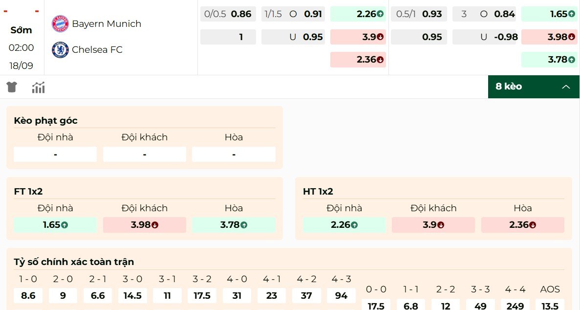 Soi Kèo Bayern Munich Vs Chelsea 02h00 18/9 – UEFA Champion League LOẠI KÈOKÈODỰ ĐOÁNKÈO CHÂU ÁBayern Munich -3/4 tráiChọn Bayern MunichKÈO TÀI XỈU3Chọn TàiKÈO CHÂU ÂUBayern Munich thắng tỷ lệ 1:1.65Chelsea thắng tỷ lệ 1:3.98Hoà 1:3.78Chọn Bayern MunichKÈO TỶ SỐ CHÍNH XÁCDự đoán: 3-2Thời gian: 02h00 (giờ Hà Nội), thứ năm, ngày 18/09/2025.Địa điểm: Sân vận động Allianz Arena.Trận đấu diễn ra thuộc vòng bảng giải đấu UEFA Champion League 2025/26.Trận thư hùng giữa Bayern Munich vs Chelsea được kỳ vọng tạo nên sự kịch tính trong từng đường bóng. Hai câu lạc bộ đều có tham vọng lớn tại Champion League nên chắc chắn sẽ muốn có 3 điểm trong ngày khai màn. Bạn hãy tham khảo bài viết tại kèo nhà cái để theo dõi chỉ số chuyên môn và bảng kèo chi tiết của cặp đấu này nhé.Đánh giá tỷ lệ kèo Bayern Munich vs ChelseaTrận cầu duyên nợ giữa 2 câu lạc bộ này không chỉ nóng trên sân cỏ mà còn sôi động trên bảng kèo. Các bạn có thể điểm qua những tỷ lệ bóng đá sẽ xuất hiện trong cuộc đối đầu giữa Bayern Munich vs Chelsea như sau:Kèo chấp 3/4Hùm xám nước Đức sẽ được chơi trên thánh địa Allianz Arena trong cuộc tiếp đón The Blues. Vì vậy, không có gì bất ngờ khi thầy trò HLV Kompany được nhận định ở cửa trên. Bên cạnh đó, lịch sử chạm trán đang nghiêng về phía đại diện đến từ Bundesliga. Do đó, các bạn nên ưu tiên chọn kèo chấp 3/4 trái cho Bayern Munich.Kèo tài xỉu 3 tráiCác trận đấu giữa Bayern Munich vs Chelsea thường kết thúc số lượng bàn thắng rất lớn. Theo thống kê mới nhất, 6 trong tổng số 7 lần gặp nhau trước đây của hai đội đều có từ 3 pha lập công trở lên.Hàng công của Hùm xám cũng được đánh giá rất cao khi ghi tới 16 bàn thắng chỉ trong 5 trận gần đây. Trong khi đó, các chân sút của The Blues cũng ghi đến 13 pha làm bàn trong 5 lượt trận đã qua. Vì vậy, các bạn nên dự đoán kèo Tài 3 trái ở cuộc chạm trán ngày 18/9.Giới thiệu bảng kèo Bayern Munich vs ChelseaKèo châu ÂuMặc dù đang là ĐKVĐ FIFA Club World Cup nhưng Chelsea luôn tỏ ra thất thế hơn mỗi lần đối đầu với Hùm xám xứ Bavaria. Các chuyên gia soi kèo Bayern Munich vs Chelsea đánh giá đội chủ nhà có cơ hội thắng lớn hơn thông qua kèo 1×2 là:Cửa 1: Bayern Munich thắng tỷ lệ 1:1.65.Cửa 2: Chelsea thắng tỷ lệ 1:3.98.Cửa X: kết quả hòa tỷ lệ 1:3.78.Thống kê phong độ hiện tại giữa Bayern Munich vs ChelseaCả hai đội bóng đều có được những chuỗi trận vô cùng ấn tượng trước ngày Champion League khởi tranh. Dưới đây là các thống kê chuẩn xác nhất về phong độ của 2 CLB này:Chủ nhà Bayern MunichĐội bóng được dẫn dắt bởi Kompany chỉ phải nhận 2 trận thua trong 10 lượt đấu gần nhất. Trước thời điểm trận đấu Bayern Munich vs Chelsea diễn ra, đại diện của nước Đức đang trải qua 7 trận toàn thắng. Nếu chỉ tính riêng mùa giải 2025/2026, Hùm xám đã thắng 4 trận trên mọi đấu trường.Cụ thể, Bayern Munich vượt qua Stuttgart ở Siêu cúp Đức với kết quả 2-1. Sau đó, câu lạc bộ này giành 2 thắng lợi ở Bundesliga trước Leipzig 6-0 và Augsburg 3-2. Tại Cúp quốc gia, Hùm xám cũng đánh bại Wehen 3-2.Đội khách ChelseaTrước khi trận đấu giữa Bayern Munich vs Chelsea bắt đầu, đại diện đến từ London cũng sở hữu phong độ rất thăng hoa. Đoàn quân của HLV Maresca đang bất bại trong 10 trận liên tiếp ở mọi giải đấu. Thậm chí, Chelsea còn đánh bại PSG hùng mạnh để lên ngôi ở FIFA Club World Cup.Kể từ khi mùa bóng mới khởi tranh, The Blues sở hữu thành tích vô cùng ấn tượng. Đội bóng này vượt qua Fulham 2-0 và thắng West Ham 5-1 ở Ngoại hạng Anh. Bên cạnh đó, Chelsea chỉ có một trận hòa duy nhất trước nhà ĐKVĐ FA Cup với tỉ số 0-0.Nhận định thông số đối đầu Bayern Munich vs ChelseaLịch sử Cúp châu Âu ghi nhận hai câu lạc bộ hàng đầu tại lục địa đã gặp nhau 7 lần trong quá khứ. Chỉ số đối đầu của Bayern Munich hoàn toàn vượt trội so với The Blues. Theo đó, đại diện của Bundesliga đã giành tới 5 chiến thắng trước đối thủ. Ở bên kia chiến tuyến, Chelsea có 2 lần đánh bại Hùm xám, trong đó có chiến thắng nghẹt thở tại chung kết UCL 2012.Hùm xám có thành tích đối đầu áp đảoDự kiến đội hình, tỉ số Bayern Munich vs Chelsea 18/9Ở thời điểm hiện tại, sức mạnh của hai câu lạc bộ đã có ít nhiều thay đổi. Để chuẩn bị cho trận mở màn tại Champion League 2025/2026 các đội bóng đều gặp bất lợi về nhân sự. Bên phía chủ nhà, Hùm xám thiếu vắng Musiala, Bischof và Davies. Trong khi đó, The Blues cũng mất đi các trụ cột gồm Delap, Palmer, Essugo và Colwill. Dưới đây là những gương mặt sẽ thi đấu ở cuộc thư hùng ngày 18/9:Bayern Munich: Neuer, Upamecano, Schmitz, Tah, Kimmich, Laimer, Goretzka, Pavlovic, Olise, Diaz, Kane.Chelsea: Sanchez, Chalobah, Cucurella, Gusto, James, Caicedo, Fernandez, Walsh, Neto, Joao Pedro, Estêvão.Dàn sao Bayern Munich sẽ xuất trận tại UCLNhìn vào chất lượng đội hình của 2 bên, các bạn chắc chắn sẽ được chứng kiến một trậ