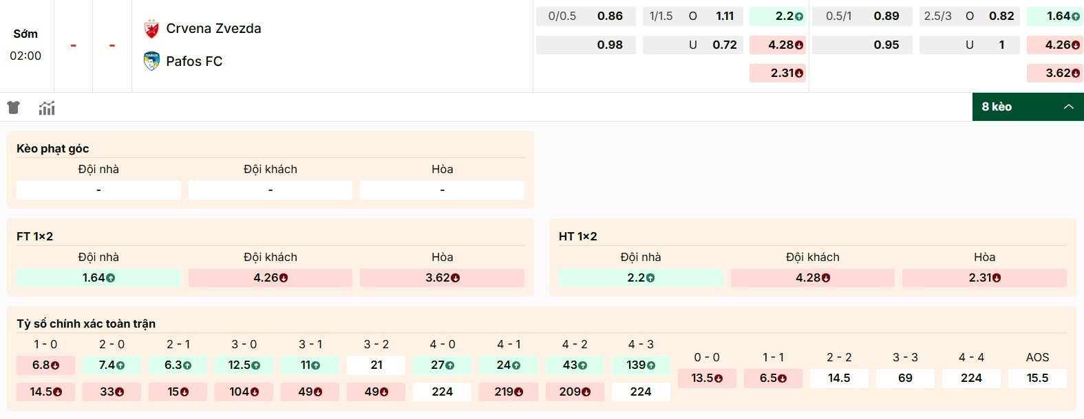 Soi Kèo Crvena Zvezda Vs Pafos FC 02h00 20/08 – UEFA Champion League LOẠI KÈOKÈODỰ ĐOÁNKÈO CHÂU ÁCrvena Zvezda -3/4 tráiChọn Crvena ZvezdaKÈO TÀI XỈU2.5/3Chọn TàiKÈO CHÂU ÂUCrvena Zvezda thắng tỷ lệ 1:1.64Pafos FC thắng tỷ lệ 1:4.26Hoà 1:3.62Chọn Crvena ZvezdaKÈO TỶ SỐ CHÍNH XÁCDự đoán: 2-1Thời gian: 02h00 (giờ Hà Nội), thứ Tư, ngày 20/08/2025.Địa điểm: Sân vận động Stadion Rajko Mitić.Trận đấu diễn ra thuộc Vòng loại UEFA Champion League 2025/2026.Crvena Zvezda vs Pafos FC sẽ có màn đối đầu giàu cảm xúc lại lượt trận cuối của vòng loại UCL. Đại diện đến từ Serbia được nhận định mạnh hơn và có nhiều cơ hội chiến thắng. Vậy các bạn đã biết đến bảng kèo chi tiết trong cuộc chạm trán này chưa? Hãy tham khảo bài viết nhận định kèo bóng đá để khám phá thông tin nhận định quan trọng về trận đấu ngày 20/08.Dự đoán kèo Crvena Zvezda vs Pafos FCTrận đấu lượt đi diễn ra hôm 20/08 sắp tới chắc chắn sẽ chứng kiến rất nhiều tỷ lệ kèo nổi bật. Các bạn có thể điểm qua danh sách kèo đấu hot nhất trong cuộc thư hùng giữa Crvena Zvezda vs Pafos FC như sau:Kèo chấp 3/4Crvena Zvezda là đại diện quen thuộc thường xuyên tham gia Cúp châu Âu. Bởi vậy đại diện của Serbia được chuyên gia nhận định nằm ở cửa trên so với đối thủ. Bên cạnh đó, lợi thế sân nhà sẽ giúp Sao Đỏ Belgrade tạo ra thế trận tốt trước Pafos. Mọi người có thể dự đoán kèo chấp 3/4 nghiêng về đội chủ nhà.Thông tin kèo Crvena Zvezda vs Pafos FCKèo tài xỉu 2.5/3 tráiTheo thống kê từ chuyên gia, hàng công của Crvena Zvezda đang đạt phong độ rất cao. Đội bóng này đã ghi đến 14 pha lập công chỉ trong 5 trận gần nhất. Do đó, các chân sút bên phía Sao Đỏ Belgrade sẽ tạo ra nhiều tình huống ghi bàn về phía đối phương. Các bạn hãy nhận định cửa Tài 2.5/3 trái trong trận đấu tới.Kèo châu ÂuTrong trận cầu giữa Crvena Zvezda vs Pafos FC, đại diện của Serbia được dự đoán có cơ hội thắng vượt trội hơn. Các chuyên gia đưa ra nhận định chi tiết về mức keo 1×2 đó là:Cửa 1: Crvena Zvezda thắng tỷ lệ 1:1.64.Cửa 2: Pafos FC thắng tỷ lệ 1:4.26.Cửa X: kết quả hòa tỷ lệ 1:3.62.Đánh giá phong độ giữa Crvena Zvezda vs Pafos FCHai câu lạc bộ Crvena Zvezda và Pafos FC đều sở hữu thành tích thi đấu cực kỳ ấn tượng trong thời gian gần đây. Hãy cũng theo dõi chỉ số thống kê chi tiết nhất về phong độ giữa hai đội nhé.Bên phía Sao Đỏ BelgradeĐội bóng giàu truyền thống của Serbia đang trải qua chuỗi trận bất bại lên tới con số 12 trên mọi đấu trường. Nếu xét đến 5 trận gần nhất, Crvena Zvezda đã thắng tới 4 trận và có một kết quả hòa.Trước khi cặp đấu Crvena Zvezda vs Pafos FC diễn ra, đội chủ nhà đã đánh bại Mladost 2-1, thắng TSC 1-0, Lech Poznan 3-1 và Lincoln Red Imps 5-1. Trận cầu chia điểm duy nhất của câu lạc bộ này diễn ra trước Lech Poznan với kết quả 1-1.Phong độ của Sao Đỏ BelgradeBên phía đội kháchĐể chuẩn bị cho trận đấu giữa Crvena Zvezda vs Pafos FC, đại diện của Cyprus cũng có được 7 trận bất bại liên tiếp. Trong đó, đội bóng này giành được 4 thắng lợi cùng 3 trận hòa.Khi xét riêng 5 lượt trận gần đây, Pafos FC cũng cho thấy phong độ rất cao với 3 chiến thắng và 2 trận chia điểm. Cụ thể, câu lạc bộ này đánh bại Dynamo Kiev ở 2 lượt trận với kết quả 2-0 và 1-0, bên cạnh đó là chiến thắng 1-0 trước Tel Aviv. Hai trận hòa của Pafos FC diễn ra trước Maccabi Tel Aviv 1-1 và Orlando Pirates 1-1.Phong độ của tuyển Pafos FCDự kiến đội hình, tỉ số trận đấu Crvena Zvezda vs Pafos FC 20/08Với tính chất quan trọng của trận đấu lượt đi ngày 20/08 sắp tới, hai đội bóng có sự chuẩn bị kỹ lưỡng về nhân sự. Bên phía chủ nhà, Sao Đỏ Belgrade thiếu vắng duy nhất hậu vệ Avdic bởi chấn thương. Trong khi đó, Pafos FC cũng không có sự phục vụ của David Luiz. Dưới đây là danh sách xuất trận của 2 câu lạc bộ này:Crvena Zvezda: Matheus, Rodrigo, Sandoval, Lekovic, Veljkovic, Ivanic, Kostov, Milson, Vasilic, Bruno, Lucic.Pafos FC: Gorter, Goldar, Luckassen, Pileas, Pedrao, Michael, Sema, Sunjic, Quina, Anderson, Orsic.Điểm qua lực lượng của các đội trước cặp đấu hôm 20/08 UEFA Champion LeagueNếu xét về lực lượng hiện tại, đội chủ nhà đang có nhiều ưu thế hơn với sự xuất hiện của những chân sút giàu kinh nghiệm. Bên cạnh đó, Sao Đỏ Belgrade cũng thể hiện được bản lĩnh khi nhiều lần góp mặt ở Cúp châu Âu. Do đó, thế trận trên sân sẽ nghiêng về phía đại diện của Serbia. Rất có thể, đoàn quân của HLV Milojevic sẽ có được thắng lợi trong trận lượt đi với kết quả 2-1.Lời kếtNhư vậy, qua các chia sẻ trên, người hâm mộ đã được giải mã những thông tin nổi bật về trận đấu giữa Crvena Zvezda vs Pafos FC. Cặp thư hùng kinh điển tại vòng loại cuối cùng Cúp C1 sẽ mang đến các diễn biến bất ngờ. Bạn đừng quên theo dõi chuyên trang tin soi kèo của chúng tôi để cập nhật nhiều tin tức thú vị khác nhé. Soi Kèo Leeds United Vs Everton 02h00 19/08 – 