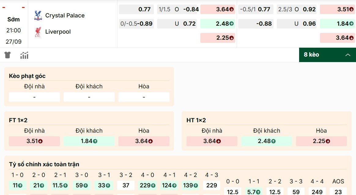 Soi Kèo Crystal Palace Vs Liverpool 21h00 27/9 – Ngoại Hạng Anh LOẠI KÈOKÈODỰ ĐOÁNKÈO CHÂU ÁCrystal Palace +3/4 tráiChọn LiverpoolKÈO TÀI XỈU2.5/3Chọn XỉuKÈO CHÂU ÂUCrystal Palace thắng tỷ lệ 1:3.51Liverpool thắng tỷ lệ 1:1.84.Hoà 1:3.64Chọn LiverpoolKÈO TỶ SỐ CHÍNH XÁCDự đoán: 0-1Thời gian: 21h00 (giờ Hà Nội), thứ Bảy, ngày 27/09/2025.Địa điểm: Sân vận động Selhurst Park.Trận đấu diễn ra trong khuôn khổ vòng 6 giải đấu Ngoại hạng Anh 2025/26.Trận cầu giữa Crystal Palace vs Liverpool được nhận định sẽ diễn ra cực kỳ kịch tính và sôi động. “Đại bàng” Crystal Palace có thể cản bước Lữ đoàn đỏ ở thời điểm hiện tại hay không? Các thông số kèo nổi bật nhất có thể xuất hiện trong màn chạm trán này là gì? Hãy tham khảo bài viết để giải mã các tỷ lệ bóng đá được quan tâm nhất.Dự đoán kèo Crystal Palace vs LiverpoolMàn thư hùng giữa 2 CLB Crystal Palace vs Liverpool được khán giả mong đợi với nhiều mã kèo hấp dẫn. Dưới đây là các đánh giá và gợi ý của giới chuyên môn về bảng kèo của trận đấu ngày 27/9:Kèo chấp 3/4 tráiCrystal Palace là đội bóng có lối đá cực kỳ khó chịu và sở hữu thành tích tốt mỗi khi chơi trên sân nhà. Câu lạc bộ này đã trải qua 12 trận bất bại liên tiếp trên sân nhà. Tuy nhiên, The Kop đang thể hiện phong độ khủng khiếp với các thắng lợi liên tiếp và dẫn đầu Premier League. Bởi vậy, Liverpool được giới mộ điệu nhận định ở cửa trên. Các bạn nên dự đoán mã kèo chấp 3/4 trái nghiêng về Lữ đoàn đỏ.Giới thiệu mã kèo Crystal Palace vs LiverpoolKèo tài xỉu 2.5/3 tráiTrước trận đấu giữa Crystal Palace vs Liverpool, đội khách đang sở hữu hàng công ấn tượng khi ghi tới 11 bàn thắng sau 5 vòng đầu tiên. Tuy nhiên, “Đại bàng” thành London lại sở hữu hàng thủ cực kỳ chắc chắn khi chỉ phải nhận 2 bàn thua. Bên cạnh đó, 3 trong 5 cuộc đối đầu trực tiếp gần nhất giữa 2 bên có ít hơn 3 bàn thắng xuất hiện. Vì thế, mọi người hãy nhận định mã kèo Xỉu 2.5/3 trái.Kèo châu ÂuCác chuyên gia soi kèo Crystal Palace vs Liverpool đánh giá The Kop sẽ gặp rất nhiều khó khăn ở trận làm khách sắp tới. Tuy nhiên, cửa thắng của thầy trò Arne Slot vẫn nhỉnh hơn đối phương. Các mã kèo 1×2 đáng chú ý gồm có:Cửa 1: Crystal Palace thắng tỷ lệ 1:3.51.Cửa 2: Liverpool thắng tỷ lệ 1:1.84.Cửa X: kết quả hòa tỷ lệ 1:3.64.Nhận xét phong độ Crystal Palace vs LiverpoolTrước khi bước vào lượt trận thứ 6 NHA, đây là hai câu lạc bộ đang bất bại ở đấu trường này. Dưới đây là thông tin chuẩn xác nhất về thành tích thi đấu hiện tại của 2 bên:Chủ nhà Crystal PalaceKể từ khi mùa giải 2025/2026 chính thức khởi tranh, “Đại bàng” đã trải qua 9 trận chưa nếm mùi thất bại. Nếu chỉ xét đến 5 lượt trận gần nhất, nhà ĐKVĐ Siêu Cúp Anh đã giành được 3 thắng lợi cùng 2 trận chia điểm.Các cầu thủ Crystal Palace đã vượt qua West Ham 2-1, Millwall (trên chấm luân lưu) và Aston Villa 3-0. Những trận hòa của đội bóng này diễn ra khi đối đầu với Sunderland 0-0 và Fredrikstad 0-0.Đội khách LiverpoolTrước khi cặp đấu Crystal Palace vs Liverpool khởi tranh, Lữ đoàn đỏ đăng thăng hoa trên mọi đấu trường. Đoàn quân của HLV Arne Slot đã toàn thắng trong 6 trận đấu liên tiếp kể từ đầu mùa. Ở Champion League, The Kop đánh bại Atletico Madrid 3-2.Trở về sân chơi NHA, nhà ĐKVĐ mùa 2024/2025 thể hiện sức mạnh với 5 trận toàn thắng và dẫn đầu. Liverpool vượt qua Bournemouth 4-2, thắng Newcastle 3-2, Arsenal 1-0, Burnley 1-0 và Everton 2-1.Nhận định Crystal Palace vs Liverpool – lịch sử đối đầuTrong lịch sử Premier League, hai đội bóng đã chạm trán trực tiếp 32 trận đấu. Theo thống kê mới nhất, Lữ đoàn đỏ hoàn toàn áp đảo so với “Đại bàng” London với 20 thắng lợi cùng 6 trận hòa. Ngược lại, Crystal Palace chỉ có 6 lần đánh bại đối phương.Thông số đối đầu cực kỳ cân bằng giữa 2 bênTuy nhiên, nếu tính tới 5 lượt trận đối đầu gần nhất, chỉ số thống kê khá cân bằng. Trong đó, Crystal Palace giành được 2 chiến thắng cùng 1 lần chia điểm. Ở phía bên kia chiến tuyến, The Kop cũng có 2 lần vượt qua đối thủ.Dự kiến đội hình, tỉ số Crystal Palace vs Liverpool 27/9Đội chủ nhà chỉ thiếu vắng một cái tên duy nhất trước cuộc tiếp đón Liverpool là Sarr Ismaila. Trong khi đó, Arne Slot chào đón sự trở lại của các trụ cột nên sẽ tung ra sân đội hình tối ưu nhất. Cụ thể đó là:Crystal Palace: Henderson, Guehi, Mitchell, Munoz, Lacroix, Hughes, Wharton, Lerma, Uche, Mateta, Nketiah.Liverpool: Alisson, Bradley, Robertson, Gomez, Van Dijk, Frimpong, Gravenberch, Szoboszlai, Wirtz, Ekitike, Salah.Các ngôi sao lớn sẽ trở lại đội hình xuất phátVới đội hình gồm các tên tuổi lớn, Lữ đoàn đỏ chắc chắn sẽ duy trì sức ép rất lớn về phía “Đại bàng” London. Tuy nhiên, hệ thống phòng ngự của Crystal Palace sẽ không dễ để đối phương khoan phá. Rất có thể trận cầu giữa Crystal Palace vs Liverpool chỉ kết thúc với thắng l