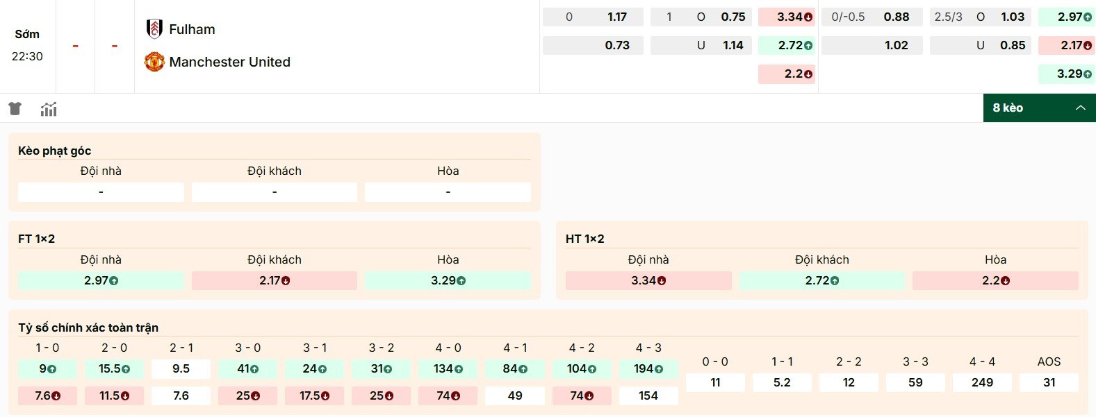 Soi Kèo Fulham Vs Manchester United 22h30 24/08 – V2 NHA LOẠI KÈOKÈODỰ ĐOÁNKÈO CHÂU ÁFulham +1/4 tráiChọn Manchester UnitedKÈO TÀI XỈU2.5/3Chọn XỉuKÈO CHÂU ÂUFulham thắng tỷ lệ 1:2.97Manchester United thắng tỷ lệ 1:2.17Hoà 1:3.29Chọn Manchester UnitedKÈO TỶ SỐ CHÍNH XÁCDự đoán: 0-2Thời gian: 22h30 (giờ Hà Nội), Chủ Nhật, ngày 24/08/2025.Địa điểm: Sân vận động Craven Cottage.Trận đấu diễn ra thuộc Vòng 2 Ngoại hạng Anh 2025/2026.Trận đấu giữa Fulham vs Manchester United ở vòng 2 EPL có ý nghĩa quan trọng với cả hai câu lạc bộ. Đặc biệt, MU cần một thắng lợi để xốc lại tinh thần sau trận ra quân không suôn sẻ. Vậy tỷ lệ kèo nổi bật nhất trong cặp đấu này có gì đáng chú ý? Hãy tham khảo bài viết kèo bóng đá để theo dõi nhận định của chuyên gia về cuộc chạm trán tại Craven Cottage nhé.Bảng kèo Fulham vs Manchester United sớm nhấtNhững cuộc đối đầu của Fulham vs Manchester United thường mang đến các tỷ lệ kèo khó đoán. Đối với trận đấu thuộc vòng thứ 2 Ngoại hạng Anh 2025/2026 sắp tới, bạn có thể điểm qua một số mức kèo hot sau:Kèo chấp 1/4Fulham là đội bóng sở hữu lối đá cực kỳ khó chịu, đặc biệt khi được chơi trên sân nhà. Vì thế, dù ở đẳng cấp thấp hơn nhưng đại diện tới từ thủ đô London không bị đánh giá yếu hơn quá nhiều so với Quỷ đỏ. Ở bên kia chiến tuyến, MU được xếp vào cửa trên nhờ sở hữu đội hình có chiều sâu hơn đội chủ nhà. Các bạn có thể nhận định tỷ lệ chấp 1/4 trái nghiêng về Man United.Tỷ lệ kèo mới nhất của trận Fulham vs Manchester UnitedKèo tài xỉu 2.5/3Cặp đấu giữa Fulham vs Manchester United nhiều khả năng sẽ xuất hiện thế trận chặt chẽ. Vì vậy, tỷ lệ tài xỉu bàn thắng trong cuộc chạm trán này ở mức không quá cao. Theo số liệu thống kê, mỗi đội bóng chỉ ghi được 9 pha lập công trong 5 vòng đấu gần nhất. Do đó, mọi người hãy nhận định kèo Xỉu 2.5/3 trái.Kèo châu ÂuMặc dù không có được thắng lợi ở trận ra quân, những phong cách chơi của Quỷ đỏ đã tiến bộ hơn so với mùa giải trước. Chính vì vậy, các chuyên gia soi kèo nghiêng về trường hợp MU thắng cuộc nhiều hơn. Tỷ lệ 1×2 trong cặp đấu này gồm có:Cửa 1: Fulham thắng tỷ lệ 1:2.97.Cửa 2: Manchester United thắng tỷ lệ 1:2.17.Cửa X: kết quả hòa tỷ lệ 1:3.29.Xem xét phong độ cửa Fulham vs Manchester UnitedỞ thời điểm hiện tại, thành tích thi đấu của hai câu lạc bộ có nhiều điểm tương đồng. Những thông tin chi tiết về phong độ giữa hai đội chơi này đó là:Chủ nhà FulhamĐội chủ sân Craven Cottage được đánh giá thi đấu vô cùng ổn định trong 5 lượt trận gần nhất. Theo đó, Fulham giành được 3 thắng lợi, 1 trận chia điểm và chỉ nhận một trận thua duy nhất. Trong trận mở màn Premier League, đội bóng này xuất sắc cầm hòa Brighton dù phải chơi ở sân khách.Phong độ của FulhamNhững chiến thắng của đại diện tới từ thủ đô London xuất hiện trước trận đấu gặp Frankfurt 1-0, Al Ittihad 4-2 và Nottingham Forest 3-1. Trận thua của Fulham xuất hiện khi đối đầu với Man City với kết quả 0-2.Đội khách Manchester UnitedĐể chuẩn bị cho cặp đấu giữa Fulham vs Manchester United ngày 25/08, thầy trò Amorim cho thấy phong độ tạm chấp nhận được. Trong 5 trận đã qua, Quỷ đỏ chiến thắng 3 lần, bên cạnh đó là một trận thua và một trận hòa.Cụ thể, Man United đón nhận thất bại ngay ở vòng 1 Ngoại hạng Anh với kết quả 0-1 trước Arsenal. Trận hòa của thầy trò HLV Amorim diễn ra trước Everton với tỉ số 2-2. Ngoài ra, MU đã giành 3 thắng lợi trước West Ham 2-1, Bournemouth 4-1 và Fiorentina trên chấm 11m.Thành tích gần đây của Quỷ đỏThành tích chạm trán giữa Fulham vs Manchester UnitedLịch sử đối đầu đang ủng hộ đội chủ sân Old Trafford trước giờ bóng lăn. Hai câu lạc bộ đã chạm trán 36 lần chỉ tính riêng tại Ngoại hạng Anh trong quá khứ. Theo đó, MU đã chiến thắng 26 trận và có 6 lần chia điểm trước đối thủ. Ngược lại, Fulham mới chỉ có 4 lần vượt qua Manchester United.Nếu xét riêng 5 trận gặp nhau trực tiếp gần nhất giữa Fulham vs Manchester United, Quỷ đỏ vẫn nắm giữ lợi thế. Câu lạc bộ này giành đến 3 thắng lợi và phải nhận 2 thất bại trước đối phương.Lợi thế về mặt đối đầu nghiêng về đội kháchDự kiến đội hình, tỉ số trận cầu Fulham vs Manchester United 25/8Đội chủ sân Craven Cottage chắc chắn không thể tung ra sân các cầu thủ Sessegnon và Robinson vì chấn thương. Bên phía đội khách, HLV Amorim sẽ không có sự góp mặt của Mazraoui. Bởi vậy, danh sách thi đấu của 2 CLB gồm có:Fulham: Leno, Andersen, Bassey, Castagne, Diop, Cairney, Lukic, Iwobi, Smith Rowe, Rodrigo, Traore.Manchester United: Onana, Dalot, de Light, Yoro, Dorgu, Casemiro, Fernandes, Mount, Cunha, Mbeumo, Sesko.Dự kiến các ngôi sao xuất hiện khi 2 đội gặp nhauTừ đội hình xuất trận như trên, người hâm mộ sẽ mong chờ vào màn đối đầu kịch tính giữa Fulham vs Manchester United. Với triết lý chơi mới mẻ cùng sự tỏ