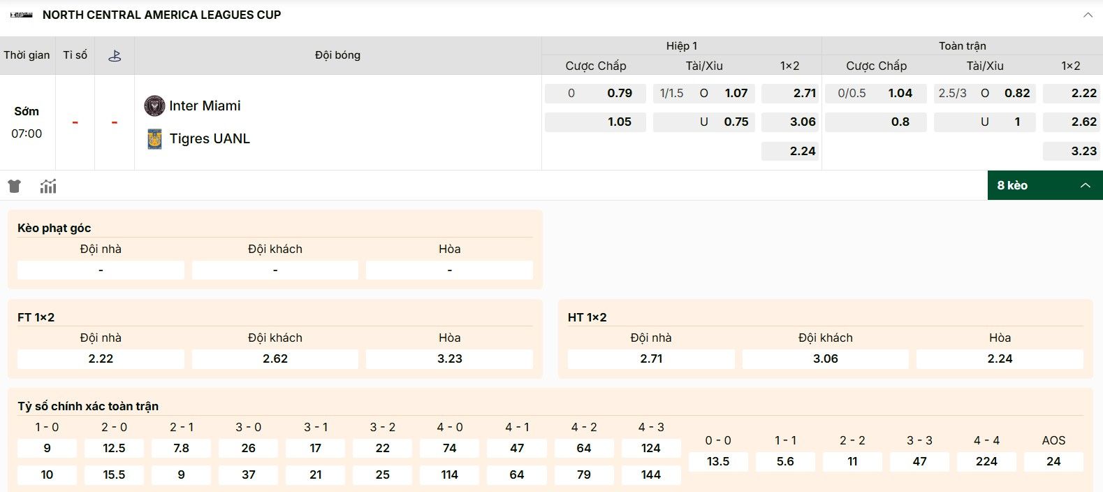 Soi Kèo Inter Miami Vs Tigres UANL 07h00 21/08 – Leagues Cup LOẠI KÈOKÈODỰ ĐOÁNKÈO CHÂU ÁInter Miami -1/4 tráiChọn Inter MiamiKÈO TÀI XỈU2.5/3Chọn TàiKÈO CHÂU ÂUInter Miami thắng tỷ lệ 1:2.22Tigres UANL thắng tỷ lệ 1:2.62Hoà 1:3.23Chọn Inter MiamiKÈO TỶ SỐ CHÍNH XÁCDự đoán: 3-2Thời gian: 07h00 (giờ Hà Nội), thứ Năm, ngày 21/08/2025.Địa điểm: Sân vận động Lockhart.Trận đấu diễn ra thuộc Vòng Tứ kết Leagues Cup 2025/2026.Cuộc đối đầu giữa Inter Miami vs Tigres UANL sẽ mang đến diễn biến sôi động kèm theo nhiều tỷ lệ kèo hấp dẫn. Ở trận đấu này, đại diện tới từ MLS sẽ quyết tâm giành thắng lợi để tiến sâu tại Leagues. Liệu rằng Messi cùng các đồng đội có hiện thực hóa mục tiêu này không? Hãy tham khảo bài viết để cập nhật thêm các thông tin kèo bóng đá nổi bật của trận cầu nhé.Bảng kèo Inter Miami vs Tigres UANL sớm nhấtBên cạnh sự chuẩn bị của 2 câu lạc bộ, tin tức về bảng tỷ lệ kèo hot nhất trong trận đấu Inter Miami vs Tigres UANL được hàng ngàn người chơi tìm kiếm. Dưới đây là các mức kèo được quan tâm nhất:Kèo chấp 1/4Thầy trò HLV Mascherano sẽ nắm đôi chút lợi thế trước đối thủ khi được chơi tại sân nhà Lockhart. Tại điểm tựa tinh thần này Inter Miami đang có được thành tích bất bại trong 9 trận liên tiếp. Trong khi đó, đại diện đến từ Mexico có kết quả khá tệ khi phải chơi trên sân khách khi mới chỉ thắng 2/10 trận đấu. Vì vậy, các bạn hãy nhận định kèo chấp 1/4 trái nghiêng về Inter Miami.Bật mí tỷ lệ kèo trận Inter Miami vs Tigres UANLKèo tài xỉu 2.5/3Trận đấu giữa Inter Miami vs Tigres UANL hứa hẹn sẽ xuất hiện số lượng bàn thắng rất lớn. Theo thống kê mới nhất, 4/5 trận gần đây của Miami Inter đều xuất hiện từ 3 pha lập công trở lên. Con số này bên phía Tigres UANL là 5/5 trận đấu. Ngoài ra, đại diện đến từ Mexico đang sở hữu hàng công rất ấn tượng với 18 bàn thắng sau 5 lượt trận đã qua. Do đó, người chơi có thể nhận định cửa Tài 2.5/3 trái trong cuộc chạm trán sắp tới.Kèo châu ÂuTrận tứ kết kịch tính này sẽ xuất hiện những diễn biến bất ngờ và kết quả khó đoán. Các chuyên gia soi kèo gợi ý tỷ lệ 1×2 châu Âu tương đối cân bằng như sau:Cửa 1: Inter Miami thắng tỷ lệ 1:2.22.Cửa 2: Tigres UANL thắng tỷ lệ 1:2.62.Cửa X: kết quả hòa tỷ lệ 1:3.23.Thống kê phong độ Inter Miami vs Tigres UANLTrước khi bước vào cuộc đại chiến tại Leagues Cup 2025, hai câu lạc bộ đều được đánh giá với phong độ cao. Cùng điểm lại thành tích thi đấu gần đây của từng đội bóng nhé:Bên phía Miami InterTrước khi cặp đấu Inter Miami vs Tigres UANL khởi tranh, đoàn quân của Mascherano thi đấu khá ấn tượng. Chỉ số thống kê cho biết đội bóng này mới nhận 2 trận thua trong 10 trận đấu đã qua. Nếu chỉ xét riêng 5 trận gần đây, đại diện của MLS cũng giành tới 3 chiến thắng, bên cạnh đó là 1 thất bại và 1 trận hòa.Phong độ ổn định bên phía chủ nhàTheo đó, Messi và các đồng đội vượt qua UNAM Pumas 3-1, đánh bại Necaxa trên loạt luân lưu và thắng Atlas 2-1. Trận hòa của Inter Miami xuất hiện trước Cincinnati với kết quả 0-0. Ngoài ra, đội bóng này mới đón nhận thất bại 1-4 trước Orlando City tại MLS.Bên phía TigresĐại diện của Mexico cũng cho thấy phong độ rất cao trong 5 trận gần đây. Tigres UANL đã giành được 4 chiến thắng và phải nhận một trận thua trước Los Angeles FC với kết quả 1-2 tại Leagues Cup.Những thắng lợi của Tigres diễn ra trong các cuộc chạm trán với San Diego FC (2-1) và Houston Dynamo (4-1) tại Leagues Cup. Ngoài ra là các chiến thắng trước Puebla (7-0) và Toluca (4-3) tại giải VĐQG Mexico.Thành tích thăng hoa của đội kháchNếu xét về thành tích chạm trán trực tiếp giữa Inter Miami vs Tigres UANL, đội bóng của Mexico được nhận định nhỉnh hơn. Chuyên gia soi kèo cho biết 2 đội gặp nhau một lần duy nhất tại Leagues Cup 2024 và Tigres đã giành thắng lợi bằng kết quả 2-1.Dự kiến đội hình, tỉ số Inter Miami vs Tigres UANL 21/08Hai câu lạc bộ đều thiếu vắng những chân sút xuất sắc nhất trên hàng công trong trận tứ kết hôm 21/08 sắp tới. Về phía chủ nhà, HLV Mascherano không thể sử dụng Messi vì chấn thương gặp phải từ trận đấu với Necaxa. Trong khi đó, đội khách sẽ thiếu vắng tiền đạo Ibanez. Dưới đây là danh sách những gương mặt sẽ xuất hiện trong trận tứ kết sắp tới:Inter Miami: Rocco Rios, Falcon, Fray, Alba, Aviles, de Paul, Busquets, Cremaschi, Picault, Suarez, Allende.Tigres UANL: Guzman, Joaquim, Sanchez, Garza, Lorona, Aquino, Correa, Romulo, Vigon, Gignac, Lopez.Dự kiến các chân sút sẽ xuất hiện tại trận tứ kếtTừ danh sách đội hình của hai đội, các bạn có thể trông chờ vào một trận đấu nảy lửa. Trong đó, Inter Miami sẽ tận dụng ưu thế sân nhà để nắm thế chủ động trước đại diện của Mexico. Nhiều khả năng trận cầu giữa Inter Miami vs Tigres UANL sẽ khép lại bằng thắng lợi 3-2 cho đội chủ sân Lockhart.Lời kếtNhư vậy, bài viết này vừa ma