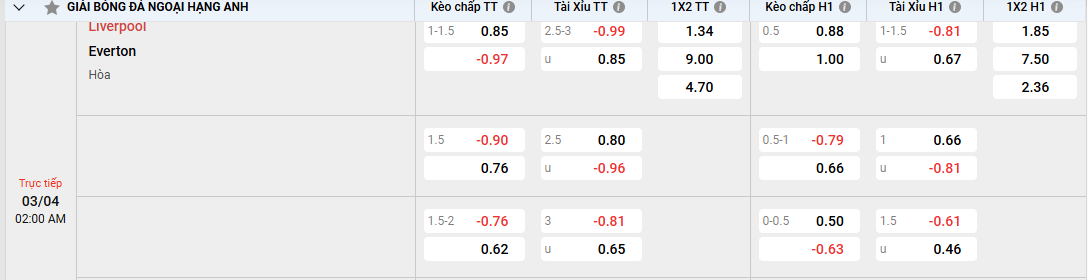 Soi kèo Liverpool vs Everton 02h00 ngày 03/04/2025 Ngoại Hạng Anh Trên sân nhà Anfield The Kop tiếp đón Everton trên con đường chinh phục ngôi vương tại Premier League. Tất cả đang chờ đợi vào một thế trận nhiều bàn thắng, cùng kèo nhà cái nhìn nhận tổng quan về kèo trận này và cùng chuyên gia soi kèo Liverpool vs Everton bàn luận đội chiến thắng.Tổng quan về soi kèo Liverpool vs EvertonTrận đấu được dự đoán là thế trận một chiều, tuy nhiên Everton luôn là một ẩn số khi có những trận đấu họ thi đấu xuất sắc và hạ đối thủ mạnh. Thành tích đối đầu trong 10 trận gần đây cho thấy Liverpool cũng không chiếm nhiều ưu thế với 4 thắng hòa 4 và thua 2 trận.Soi kèo Liverpool vs Everton – Kèo Châu ÁThành tích hai đội gần đâySau 29 vòng đấu Liverpool đang đứng đầu BXH với 70 điểm bỏ xa đội thứ 2 là Arsenal tới 12 điểm. Gần nhất họ có để thua Newcastle 1-2 trên sân khách tại League Cup. Đáng tiếc nhất là thất bại tại C1 năm nay khi họ có lợi thế trận lượt đi những thua trên chấm 11m trước PSG. Trong 5 trận gần nhất họ thắng 3 và thua 2 trận, hiện tại họ chỉ tập trung cho ngôi vô địch và nếu có được chiến thắng con đường trở nên bằng phẳng hơn.Bên phía Everton họ đang có được vị trí thứ 15 với 34 điểm cách xa nhóm xuống hạng tới 7 điểm. Một mùa giải với phong độ không mấy ổn định họ cần 3 chiến thắng để chắc chắn trụ hạng thành công. Everton đã triển khai một chiến thuật phòng thủ và bất bại trong 6 trận gần nhất với 5 trận hòa và 1 chiến thắng.Tương quan lực lượng trước trận Liverpool vs EvertonTrong khi Liverpool đang có quân số khá đảm bảo những phải xoay tua trên nhiều đấu trường con số chấn thương đã là 6 người trong đó có Alexander-Arnold, Becker, Conor Bradly là những cầu thủ tài năng sẽ khiến một số tuyến của họ yếu đi.Đội khách Everton cũng thiếu vằng 5 cầu thủ dính chấn thương như Orel Mangala, Iliman Ndiaye hay tiền đạo Dominic Calvert-Lewin. Hàng công của họ trông chờ vào Beto Betuncal.Soi kèo Liverpool vs Everton tương quan lực lượngLối chơi dự kiến từ phân tích chuyên giaVới nhiều lợi thế về tinh thần, chất lượng cầu thủ và sân nhà Liverpool sẽ chơi tấn công ngay từ đầu. Tuy nhiên trận Derby chưa bao giờ là dễ dàng cho chủ nhà, họ cũng cần tập trung nơi hàng thủ trước khi có những đợt tấn công với số đông cầu thủ.Everton đang chơi tốt với chiến thuật phòng ngự phản công khá hiệu quả ở những trận đấu vừa qua. Tuy là trận Derby nhưng phong độ khá chênh lệch và họ sẽ tiếp tục thi đấu chắc chắn phần sân nhà trước khi có những đợt tấn công chớp nhoáng.Soi kèo Liverpool vs Everton chọn kèo đặt cượcKèo cược chấp (0:1 1/4): Nhà cái đánh giá về phong độ và thực lực hiện tại ra kèo tương đối khó đặt cược tuy nhiên người chơi nên chọn kèo dưới cho trận Derby vốn dĩ chưa bao giờ là dễ dàng.Đặt cược: Everton + 1 1/4.Kèo tài xỉu (2 3/4): Nhà cái hướng đến một trận không quá 3 bàn thắng, nhìn lại 5 trận đối đầu gần nhất có 1/5 trận ra tài, ở các đấu trường khác hai đội đều có 2/5 trận có kết quả ra tài. Trận này chọn xỉu cũng là lựa chọn phù hợp.Đặt cược: Xỉu 2 3/4.Chọn kèo Hòa Châu Âu, dự đoán tỷ số 2-2.Soi kèo Liverpool vs Everton nhận định từ chuyên giaĐội hình dự kiến thi đấu Liverpool vs EvertonLiverpool: 62 Caoimhin Kelleher, 78 Jarell Quansah, 5 Ibrahima Konate, 4 Virgil van Dijk, 26 Andrew Robertson, 38 Ryan Jiro Gravenberch, 10 Alexis Mac Allister, 11 Mohamed Salah Ghaly, 8 Dominik Szoboszlai, 7 Luis Fernando Diaz Marulanda, 20 Diogo Jota.HLV: Arne Slot.Everton: 1 Jordan Pickford, 19 Vitaliy Mykolenko, 32 Jarrad Branthwaite, 6 James Tarkowski, 15 Jake Obrien, 37 James Garner, 27 Idrissa Gana Gueye, 24 Carlos Alcaraz, 16 Abdoulaye Doucoure, 11 Jack Harrison, 14 Beto Betuncal.HLV: David Moyes.Kết luậnTổng hợp soi kèo Liverpool vs Everton đây là trận derby vùng Merseyside dự đoán sẽ là một cuộc đọ sức đáng chờ đợi tại Ngoại hạng Anh. Với phong độ vượt trội, đội chủ sân Anfield có nhiều cơ hội giành trọn 3 điểm trước một Everton đang gặp nhiều khó khăn và họ sẽ băng băng về đích. Soi kèo Manchester City vs Leicester City 01h45, 03/04/2025 Ngoại Hạng Anh Soi kèo Chelsea vs Tottenham 02h00 ngày 04/04/2025 Ngoại Hạng Anh Tin liên quan Soi Kèo Torino Vs Como 00h30 25/11 – Vô Địch Ý Soi Kèo Real Betis Vs Girona 22h15 23/11 – La Liga Soi Kèo Valencia Vs Levante 3h 22/11 – La Liga 2025 – 2026 Soi Kèo Bahia Vs Fortaleza CE 4h 21/11 – Brasileirão Série A Soi Kèo Fluminense Vs Flamengo 7h30 20/11 – VĐQG Brazil Soi Kèo Belgrano Vs Union Santa Fe 3h 18/11 – VĐQG Argentina Soi Kèo Godoy Cruz Vs Deportivo Riestra 4h 17/11 – Liga Profesional Soi Kèo Thổ Nhĩ Kỳ Vs Bulgaria 00h 16/11 – Vòng Loại World Cup 2026