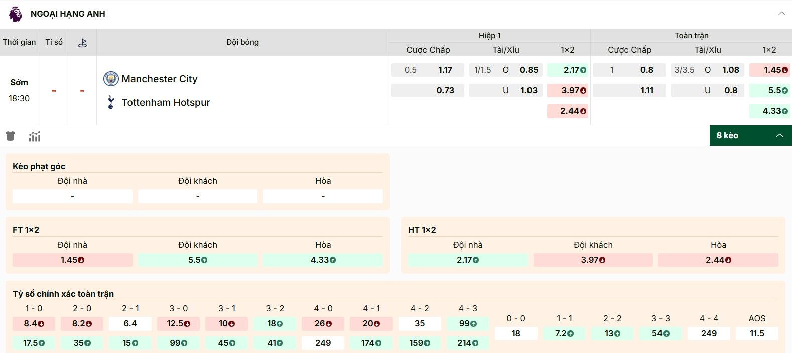 Soi Kèo Manchester City vs Tottenham Hotspur 18h30 23/08 – V2 NHA LOẠI KÈOKÈODỰ ĐOÁNKÈO CHÂU ÁManchester City -1 tráiChọn Manchester CityKÈO TÀI XỈU3/3.5Chọn TàiKÈO CHÂU ÂUManchester City thắng tỷ lệ 1:1.45Tottenham thắng tỷ lệ 1:5.5Hoà 1:4.33Chọn Manchester CityKÈO TỶ SỐ CHÍNH XÁCDự đoán: 3-2Thời gian: 18h30 (giờ Hà Nội), thứ Bảy, ngày 23/08/2025.Địa điểm: Sân vận động City of Manchester Stadium.Trận đấu diễn ra thuộc Vòng 2 giải Ngoại hạng Anh 2025/2026.Màn chạm trán giữa Manchester City vs Tottenham Hotspur tại vòng 2 EPL sẽ mang đến sự kịch tính từ trên sân lẫn bảng kèo. Đây là trận derby rực lửa giữa hai ông lớn đều có được thắng lợi trong ngày ra quân. Liệu rằng đội bóng nào sẽ tiếp tục có được 3 điểm ở vòng tiếp theo? Hãy tham khảo bài viết tại kèo nhà cái 5 để cập nhật danh sách tỷ lệ kèo hot nhất và nhận định chính xác của chuyên gia về cặp đấu này nhé.Bảng kèo Manchester City vs Tottenham Hotspur sớm nhấtSau khi khép lại vòng đấu thứ nhất, cả 2 câu lạc bộ đều có được màn trình diễn siêu hạng. Vì vậy, trận derby giữa hai đội ở vòng 2 Premier League được dự báo sẽ mang đến nhiều mức kèo hấp dẫn. Cụ thể đó là:Kèo chấp 1 tráiỞ cuộc đại chiến giữa Manchester City vs Tottenham Hotspur, đội chủ nhà được nhận định nhỉnh hơn. The Citizens đang sở hữu phong độ bùng nổ và có ưu thế khi được chơi tại Etihad. Bên cạnh đó, chỉ số đối đầu trực tiếp trong các trận gần nhất cũng nghiêng về thầy trò Pep Guardiola. Bởi vậy, mọi người có thể dự đoán tỷ lệ chấp 1 bàn thắng nghiêng về Man City.Tỷ lệ kèo Manchester City vs Tottenham Hotspur hôm nayKèo tài xỉu 3/3.5Một trong những mức kèo được người chơi rất quan tâm tại cuộc chạm trán giữa The Citizens và Spurs đó là Over/Under. Với hàng công thắng hoa, đội chủ sân Etihad đã ghi đến 21 bàn thắng trong 5 trận đã qua. Ở bên kia chiến tuyến, Tottenham vừa có thắng lợi 3-0 trong ngày khai màn Premier League. Vì vậy, các bạn hãy nhận định kèo Tài 3/3.5 trong trận đấu Manchester City vs Tottenham Hotspur ngày 23/08.Kèo châu ÂuĐại diện của thành Manchester vẫn được giới chuyên môn đánh giá cao hơn ở cơ hội chiến thắng. Thầy trò HLV Pep Guardiola chưa từng thua trong 7 trận gần nhất chơi tại thánh địa Etihad. Dưới đây là tỷ lệ kèo 1×2 được chuyên gia gợi ý trong trận derby này:Cửa 1: Manchester City thắng tỷ lệ 1:1.45.Cửa 2: Tottenham thắng tỷ lệ 1:5.5.Cửa X: kết quả hòa tỷ lệ 4.33.Điểm qua chỉ số thắng – bại gần đây cửa 2 độiTrước khi trận đấu hôm 23/08 Manchester City vs Tottenham Hotspur khởi tranh, hai câu lạc bộ sở hữu thành tích thi đấu khá trái ngược. Cùng cập nhật thông số phong độ giữa The Citizens và Spurs ngay nhé:Bên phía chủ nhàTrong 5 trận thi đấu gần nhất, đoàn quân của Pep thể hiện sức mạnh hủy diệt với 4 chiến thắng và 1 thất bại. Đội bóng này ghi tới 21 pha lập công và đón nhận 6 bàn thua. Thất bại duy nhất của Man City diễn ra trước Al Hilal với kết quả 3-4. Bên cạnh đó, câu lạc bộ nửa xanh thành Manchester giành 4 thắng lợi trước các đội thủ như Wolves 4-0, Palermo 3-0, Juventus 5-2 và Al Ain 6-0.Phong độ bên phía The CitizensBên phía đội kháchTrước khi cặp đấu Manchester City vs Tottenham Hotspur diễn ra, thầy trò HLV Frank thể hiện phong độ khá bất ổn. Nếu chỉ tính riêng 5 trận gần nhất, “Gà trống” mới chỉ có 2 thắng lợi, 2 trận thua cùng 1 trận cầu chia điểm.Cụ thể, đội bóng phía Bắc London bị cầm hòa trước Newcastle 1-1 và để thua Bayern Munich 0-4 trong loạt trận giao hữu. Bên cạnh đó Spurs cũng thất thủ trước PSG trên chấm 11m ở trận tranh Super Cup châu Âu. Hai chiến thắng của Tottenham diễn ra khi chạm trán với các đối thủ là Arsenal 1-0 và Burnley 3-0.Phong độ bên phía SpursThông số đối đầu của Manchester City vs Tottenham HotspurLịch sử đang nghiêng về phía “Gà trống” nếu xét đến thành tích chạm trán trực tiếp trong quá khứ. Theo thống kê tại Premier League, 2 câu lạc bộ đã gặp nhau 56 trận. Trong đó, Tottenham đã giành tới 29 thắng lợi cùng 8 trận hòa. Ở phía đối diện, Man City mới chỉ có 19 lần vượt qua đối thủ.Thành tích chạm trán trong 5 trận gần đây giữa Manchester City vs Tottenham Hotspur cũng khá sít sao. Thầy trò Pep sở hữu 3 thắng lợi trước “Gà trống”. Trong khi đó, Spurs cũng giành được 2 chiến thắng trước đội nửa xanh thành Manchester.5 cuộc chạm trán gần nhất của 2 CLBDự kiến đội hình, tỉ số trận Manchester City vs Tottenham Hotspur 23/08Đội chủ nhà thiếu đi một số trụ cột ngay trước thềm mùa giải mới khởi tranh như Rodri, Kovacic hay Savinho. Ở bên kia chiến tuyến, “Gà trống” cũng mất đi các cầu thủ quan trọng gồm Maddison, Udogie và Takai. Dưới đây là danh sách dự kiến trong trận đấu hôm 23/08 sắp tới:Manchester City: Trafford, Dias, Lewis, Stones, Reijnders, Silva, O’Reilly, Nico, Doku, Marmoush, Haaland.Tottenham: Vicardio, Romero, Porro, Van de Ven, Simon, Kudus, Bentancur, Palhinha, Pape Sarr, Johnson, Richarlison. Dự 