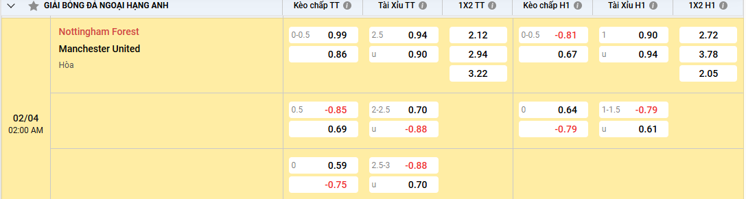 Soi kèo Nottingham vs Manchester United 02h00 ngày 02/04/2025 Ngoại Hạng Anh Với phong độ hiện tại thì Nottingham Forest sẽ tràn đầy khí thế để tiếp đón Manchester United trận đấu sẽ diễn ra lúc 02h00 ngày 2/4/2025 trong khuôn khổ vòng 30 Ngoại hạng Anh. Dưới đây các chuyên gia của tỷ lệ kèo nhà cái là phân tích về phong độ gần đây, tương quan lực lượng, lối chơi và đội hình dự kiến của Nottingham vs Manchester để quá trình chọn kèo Nottingham vs Manchester United trở nên dễ dàng hơn.Tổng quan về soi kèo Nottingham vs Manchester UnitedMùa này chủ nhà chơi quá xuất sắc khiến trận đấu này trở nên khó dự đoán hơn, MU không được đánh giá cao nhưng họ là một đội bóng lớn. Trong 10 lần gặp nhau thì MU thắng 8 và thua 2 trận dự đoán trận này sẽ có nhiều bất ngờ.Soi kèo Nottingham vs Manchester United – Kèo Châu ÁPhong độ thi đấu gần đâyNottingham Forest: Trong 5 trận gần nhất tại Premier League, Nottingham thắng 2 và hòa 3 trận trên mọi đấu trường. Họ hạ Man City 1-0, Ipswich Town 4-2 và có cho mình vị trí thứ 3 trên BXH với 54 điểm.Manchester United: Dưới sự dẫn dắt của HLV Ruben Amorim, MU đang có chuỗi 5 trận bất bại trên mọi đấu trường với 2 chiến thắng và hòa 3 trận, bao gồm chiến thắng 3-0 trước Leicester City vòng 29 trước kỳ nghỉ quốc tế. Hiện tại MU đứng thứ 13 trên BXH với 37 điểm và còn kém rất xa mục tiêu top 6 mùa này.Tương quan lực lượng hai độiMU nhận tin vui khi 5 cầu thủ quan trọng trở lại tập luyện, bao gồm các thủ môn Altay Bayindir và Tom Heaton, cùng các hậu vệ Luke Shaw, Harry Maguire và Leny Yoro. Sự trở lại của Luke Shaw đáng chú ý khi anh chỉ mới thi đấu 3 trận mùa này do chấn thương. Đội khách, Nottingham Forest sẽ thiếu vắng tiền đạo chủ lực Chris Wood do chấn thương và 2 cầu thủ khác chưa kịp bình phục. Tuy nhiên đội khung của họ vẫn hoàn toàn đầy đủSoi kèo Nottingham vs Manchester United – Tương quan lực lượngLối chơi dự kiếnNottingham Forest: Đang có phong độ tốt họ thường áp dụng lối chơi phòng ngự phản công, tận dụng tốc độ của các cầu thủ tấn công. Tuy nhiên, việc thiếu vắng Chris Wood có thể ảnh hưởng đến hiệu quả tấn công của họ trong trận này. Vẫn là một cách nhập cuộc thận trọng.Trong khi đó MU đang cho thấy sự cải thiện trong lối chơi, với hàng công hoạt động hiệu quả hơn và hàng thủ được củng cố nhờ sự trở lại của các trụ cột. Tuy nhiên hàng thủ là nơi thi đấu chưa ổn định và để thua khá nhiều bàn dễ đến kết quả không tốt của họ.Soi kèo Nottingham vs Manchester United nhận định đặt cượcKèo Châu Á (0:1/4): Kèo cược chấp phản ánh thực lực và phong độ hiện tại. Ở 5 trận đối đầu gần nhất Nottingham thắng 3/5 kèo. Ngoài ra họ thắng 4/5 kèo gần đây, MU cũng thắng 4/5 kèo cược chấp. Tỷ lệ này người chơi có thể đặt niềm tin vào MU.Đặt cược: MU + 1/4.Kèo tài xỉu (2,5): tỷ lệ cũng khá cao so với lối chơi gần đây của hai đội, 3/5 trận đối đầu ra tài. Ngoài ra 1/5 và 2/5 trận ra tài là con số tương ứng cho chủ nhà cũng như MU. Trận này dự đoán sẽ là một trận đối đầu nảy lửa và có nhiều bàn thắng.Đặt cược: Tài 2,5.Đặt cược MU thắng kèo Châu Âu và dự đoán tỷ số 1-2.Soi kèo Nottingham vs Manchester United nhận định đặt cượcĐội hình dự kiếnManchester United (4-2-3-1): Onana; Dalot, De Ligt, Yoro, Shaw; Ugarte, Mainoo; Fernandes, Garnacho, Rashford; Hojlund.Nottingham Forest (4-2-3-1): Sels; Williams, Milenkovic, Murillo, Aina; Yates, Anderson; Jota, Gibbs-White, Hudson-Odoi; Awoniyi.Kết LuậnTổng hợp soi kèo Nottingham vs Manchester United, dù chủ nhà có phong độ tốt hơn nhưng MU vẫn là đội bóng lớn và họ sẽ biết cách hạ chủ nhà. Một trận đấu cảm xúc cống hiến cho khán giả của hai đội. Khám Phá Nhà Cái Mibet: Khuyến Mãi Và Hướng Dẫn Cá Cược Soi kèo Manchester City vs Leicester City 01h45, 03/04/2025 Ngoại Hạng Anh Tin liên quan Soi Kèo Torino Vs Como 00h30 25/11 – Vô Địch Ý Soi Kèo Real Betis Vs Girona 22h15 23/11 – La Liga Soi Kèo Valencia Vs Levante 3h 22/11 – La Liga 2025 – 2026 Soi Kèo Bahia Vs Fortaleza CE 4h 21/11 – Brasileirão Série A Soi Kèo Fluminense Vs Flamengo 7h30 20/11 – VĐQG Brazil Soi Kèo Belgrano Vs Union Santa Fe 3h 18/11 – VĐQG Argentina Soi Kèo Godoy Cruz Vs Deportivo Riestra 4h 17/11 – Liga Profesional Soi Kèo Thổ Nhĩ Kỳ Vs Bulgaria 00h 16/11 – Vòng Loại World Cup 2026