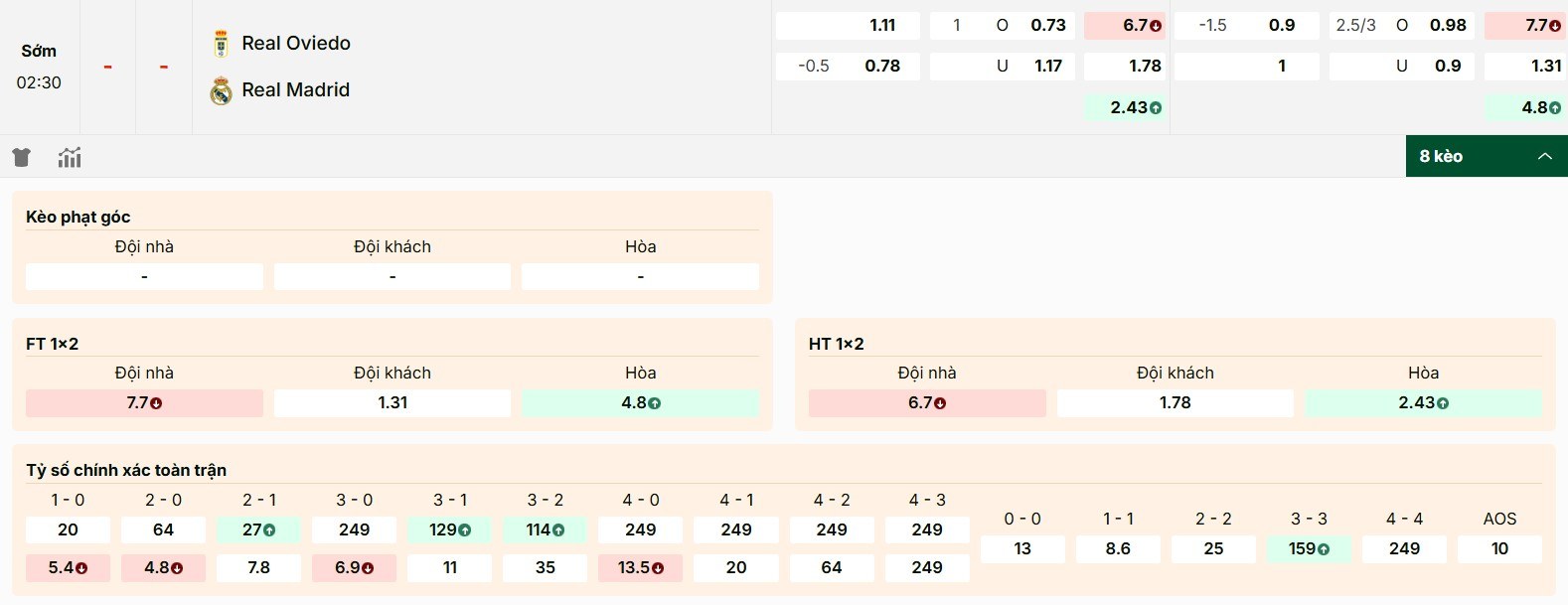 Soi Kèo Real Oviedo Vs Real Madrid 02h30 25/08, V2 La Liga LOẠI KÈOKÈODỰ ĐOÁNKÈO CHÂU ÁReal Oviedo +1.5 tráiChọn Real MadridKÈO TÀI XỈU2.5/3Chọn TàiKÈO CHÂU ÂUReal Oviedo thắng tỷ lệ 1:7.7Real Madrid thắng tỷ lệ 1:1.31Hoà 1:4.8Chọn Real MadridKÈO TỶ SỐ CHÍNH XÁCDự đoán: 1-4Thời gian: 02h30 (giờ Hà Nội), thứ Hai, ngày 25/08/2025.Địa điểm: Sân vận động Estadio Carlos Tartiere.Trận đấu diễn ra thuộc Vòng 2 giải VĐQG Tây Ban Nha La Liga 2025/2026.Cặp đấu giữa Real Oviedo vs Real Madrid tiếp tục là trận cầu mà Kền kền trắng có thể phô diễn sức mạnh vượt trội. Trước đối thủ mới lên hạng, đoàn quân của HLV Alonso liệu có giành thắng lợi hay không? Hãy tham khảo bài viết nếu muốn cập nhật chính xác những tỷ lệ kèo đáng chú ý nhất.Dự đoán kèo hot trong trận Real Oviedo vs Real MadridKhông chỉ mang đến thế trận tấn công rực lửa, trận cầu này hứa hẹn sẽ có nhiều tỷ lệ kèo hấp dẫn. Dưới đây là những mức kèo được mong đợi nhất trong trận đấu giữa Real Oviedo vs Real Madrid:Kèo chấp 1.5Dù được chơi tại sân nhà nhưng tân binh của La Liga năm nay có sức mạnh quá nhỏ bé so với Kền kền trắng. Điều đó được thể hiện ngay tại trận ra quân khi Oviedo đã thất bại trước Villarreal. Ngược lại, Los Blancos vừa sở hữu đội hình khủng và một phong độ vô cùng ấn tượng. Do đó, các bạn hãy ưu tiên nhận định kèo chấp 1.5 bàn thắng nghiêng về đội khách.Phân tích kèo trận đấu Real Oviedo vs Real MadridKèo tài xỉu 2.5/3Tỷ lệ tài xỉu bàn thắng trong trận đấu thuộc vòng 2 La Liga giữa Real Oviedo vs Real Madrid cũng được nhiều hội viên quan tâm. Real Oviedo có hàng thủ ít kinh nghiệm sẽ phải đối đầu với hàng tấn công toàn ngôi sao của Real Madrid. Trong 5 trận gần nhất, Los Blancos đã ghi đến 11 pha lập công. Nếu xét đến 5 lần chạm trán trực tiếp gần đây giữa 2 đội, Kền kền trắng đã ghi vào lưới Oviedo tới 15 bàn. Bởi vậy, các bạn hãy chọn kèo Tài 2.5/3 trái trong trận thư hùng ngày 25/08.Kèo châu ÂuĐội bóng làm khách được dự đoán sẽ có một thắng lợi dễ dàng tại lượt trận thứ 2 La Liga. Điều này được thể hiện qua các thông số kèo 1×2 là:Cửa 1: Real Oviedo thắng tỷ lệ 1:7.7.Cửa 2: Real Madrid thắng tỷ lệ 1:1.31.Cửa X: kết quả hòa tỷ lệ 1:4.8.Phong độ hiện tại của Real Oviedo vs Real MadridTrước cuộc chạm trán tại vòng 2, Oviedo và Los Blancos trải qua những trận đấu có kết quả trái ngược. Dưới đây là thống kê thành tích hiện tại của hai câu lạc bộ này:Chủ nhà Real OviedoTân binh của La Liga 2025/2026 không có được phong độ cao trong 10 trận gần nhất. Trước khi trận đấu giữa Real Oviedo vs Real Madrid bắt đầu, đội chủ nhà mới chỉ có được 2 chiến thắng trong 10 trận đã qua. Nếu xét riêng 5 trận gần đây, Oviedo chỉ giành 1 thắng lợi, 2 trận hòa cùng 2 thất bại.Cụ thể, đội bóng này giành một chiến thắng trước Cultural Leonesa với kết quả 1-0. Hai trận chia điểm của câu lạc bộ này xuất hiện trước Leganes 0-0 và Villarreal 0-0 (giao hữu). Các thất bại của Oviedo diễn ra trước La Coruna 1-2 và Villarreal 0-2 (vòng 1 La Liga).Đội khách Real MadridỞ phía bên kia chiến tuyến, Kền kền trắng cho thấy đẳng cấp vượt trội khi chỉ để thua 1 trận duy nhất trong 10 trận đã qua. Với những bổ sung chất lượng, đội bóng Hoàng gia có những kết quả rất tốt từ FIFA Club World Cup đến các trận giao hữu. Trong 5 trận đấu gần nhất, Real Madrid có được 4 chiến thắng và để thua 1 trận.Sự thăng hoa của Los BlancosTheo thống kê mới nhất, Kền kền trắng nhận thất bại trước PSG với kết quả 0-4. Bên cạnh đó, những thắng lợi của câu lạc bộ này diễn ra khi chạm trán với Tirol 4-0, Salzburg 3-0, Juventus 1-0 và Dortmund 3-2.Thông số đối đầu giữa Real Oviedo vs Real MadridHai đội bóng đã từng gặp nhau nhiều lần tại các giải đấu quốc nội và giao hữu tại Tây Ban Nha. Trong đó, lợi thế hoàn toàn thuộc về đội bóng Hoàng gia. Minh chứng rõ nhất là ở 5 trận gần nhất, Kền kền trắng giành đến 3 chiến thắng và 2 trận hòa trước câu lạc bộ này. Vì vậy, Real Oviedo thực sự là đối thủ ưa thích của Los Blancos.Dự kiến đội hình, tỉ số trận đấu Real Oviedo vs Real Madrid 25/08Tình hình nhân sự của hai câu lạc bộ trước trận đấu vòng 2 giữa Real Oviedo vs Real Madrid không mấy khả quan. Đội chủ nhà thiếu vắng nhiều trụ cột gồm Chaira, Seoane, Colombatto bởi chấn thương. HLV Alonso cũng không thể sử dụng Camavinga, Bellingham và Mendy. Dưới đây là các chân sút sẽ góp mặt trong trận cầu ngày 25/08:Real Oviedo: Escandell, Calvo, Costas, Luengo, Vidal, Cazorla, Domingues, Ilic, Reina, Fores, Vinas.Real Madrid: Courtois, Asencio, Militao, Garcia, Ceballos, Diaz, Valverde, Tchouameni, Mbappe, Guler, Vinicius.Dự kiến các ngôi sao ra sân ở vòng 2 La LigaDựa trên đội hình ra sân trong trận đấu Real Oviedo vs Real Madrid, các bạn có thể mong đợi đây là cuộc đối đầu sôi động. Đội khách chắc chắn sẽ chọn cách đá tấn công áp đặt để giành chiến thắng. Rất 